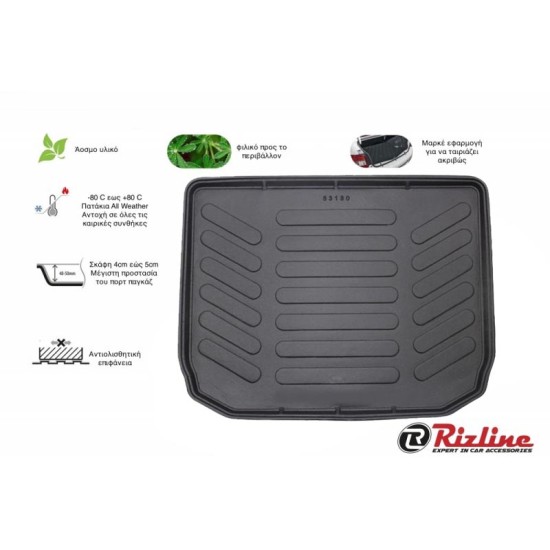 Τα υψηλής ποιότητας σκαφάκια πορτμπαγκάζ Rizline είναι κατασκευασμένα με τρόπο τέτοιο ώστε να προσαρμόζονται ακριβώς στο σχήμα του πορτ παγκάζ του αυτοκινήτου σας.Το υλικό κατασκευής τους είναι εξαιρετικά ανθεκτικό, TPE λάστιχο, υψηλής πυκνότητας. Είναι ισχυρότερο από τα αφρόδες υλικά (EVA material), υποαλλεργικό και εντελώς άοσμο που μπορεί να χρησιμοποιηθεί σε ευρύ φάσμα θερμοκρασιών από -50°C έως +80°C. Αδιάβροχα και ανθεκτικά σε λάδια και χημικά. Η κεντρική επένδυση είναι εύκολο να καθαριστεί από λάσπη, χιόνι, σκόνη, τρίχες κατοικίδιων, υγρά. Ιδανικά για επαγγελματική χρήση,εργασίες κήπου ή χρήση για την μετακίνηση του κατοικιδίου σας.Ο μοντέρνος σχεδιασμός εξασφαλίζει τη χρήση χωρίς προβλήματα.